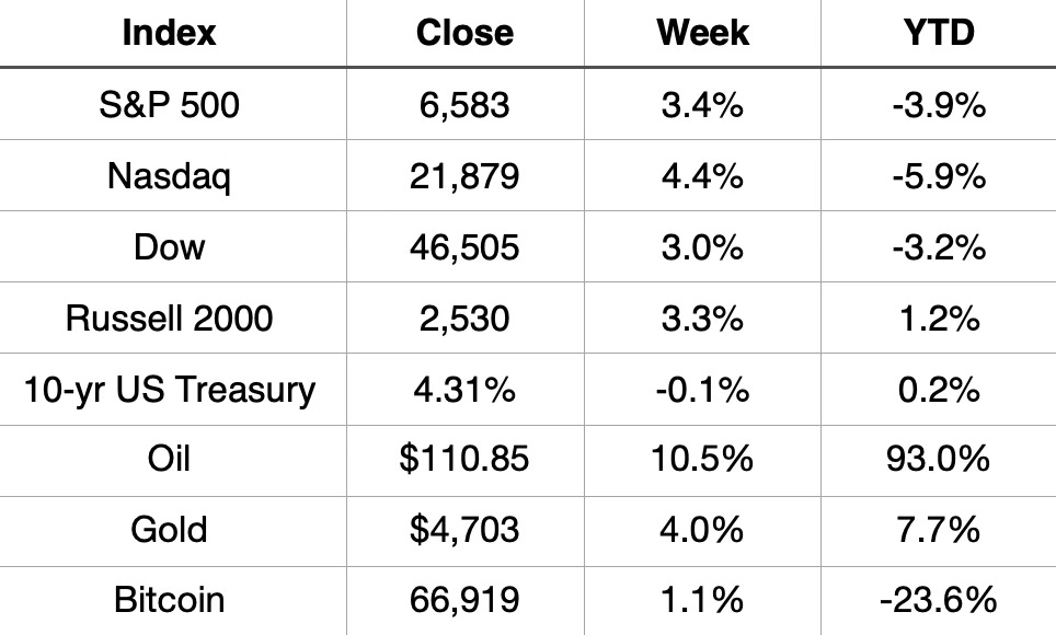 The S&P 500 snapped a five-week losing streak, gaining 3.4% to close at 6,583. The Nasdaq led the bounce at +4.4%. The Dow added 3.0%. All three are still underwater for the year, but this was the first week since the Iran war began where buyers showed up with conviction.