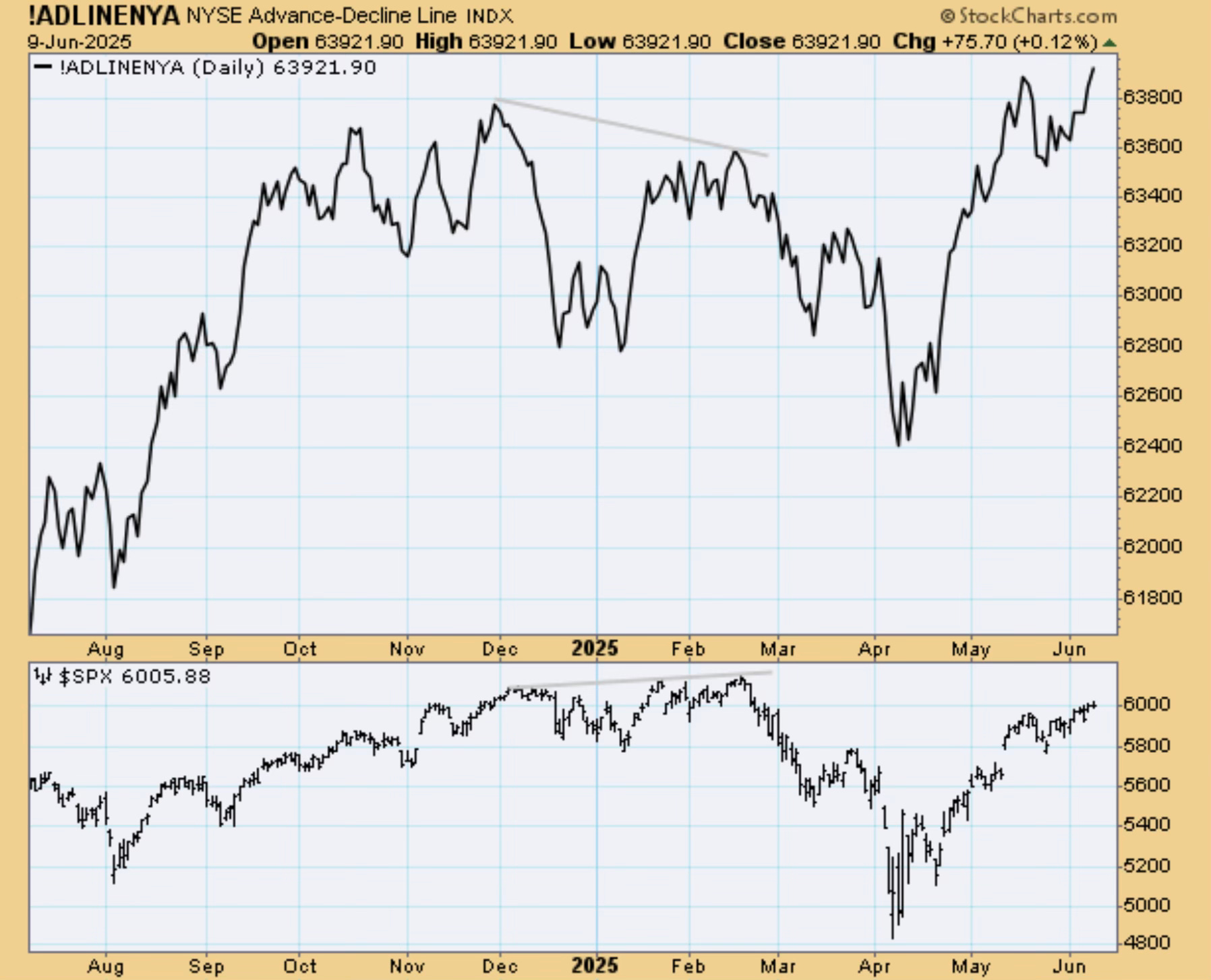 We also just saw a new high in the advance-decline line. A screaming bullish signal.