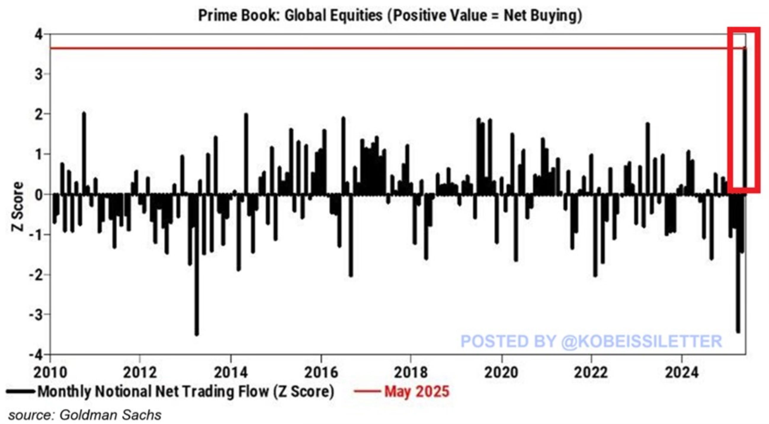 Hedge funds have now bought a record amount of global equities in May. This follows 4 consecutive months of selling. From The Kobeissi Letter who also notices the chase.