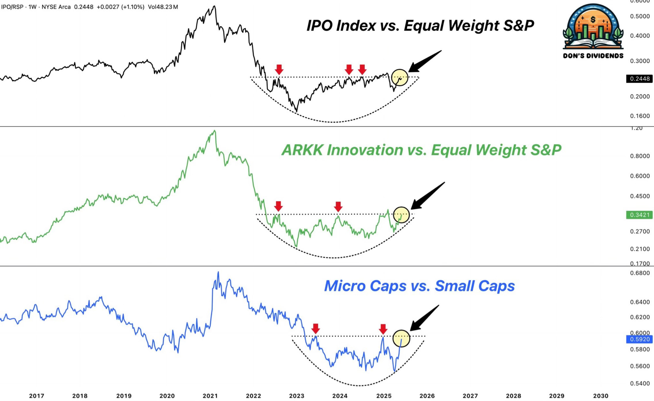 You can guess what shows for the IPO Index, ARKK and micro caps vs small caps. Great chart here from Donovan.
