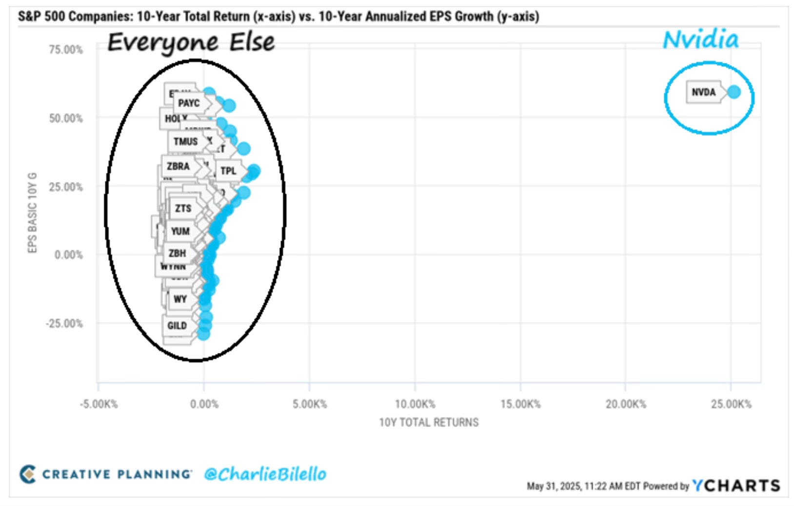 How much of an outlier has Nvidia been ? Take a look at this from Charlie Bilello. He compared Nvidia to the other S&P 500 companies over the last decade for earnings growth and shareholder return. You can see that it has been on a completely different level from all the other companies.