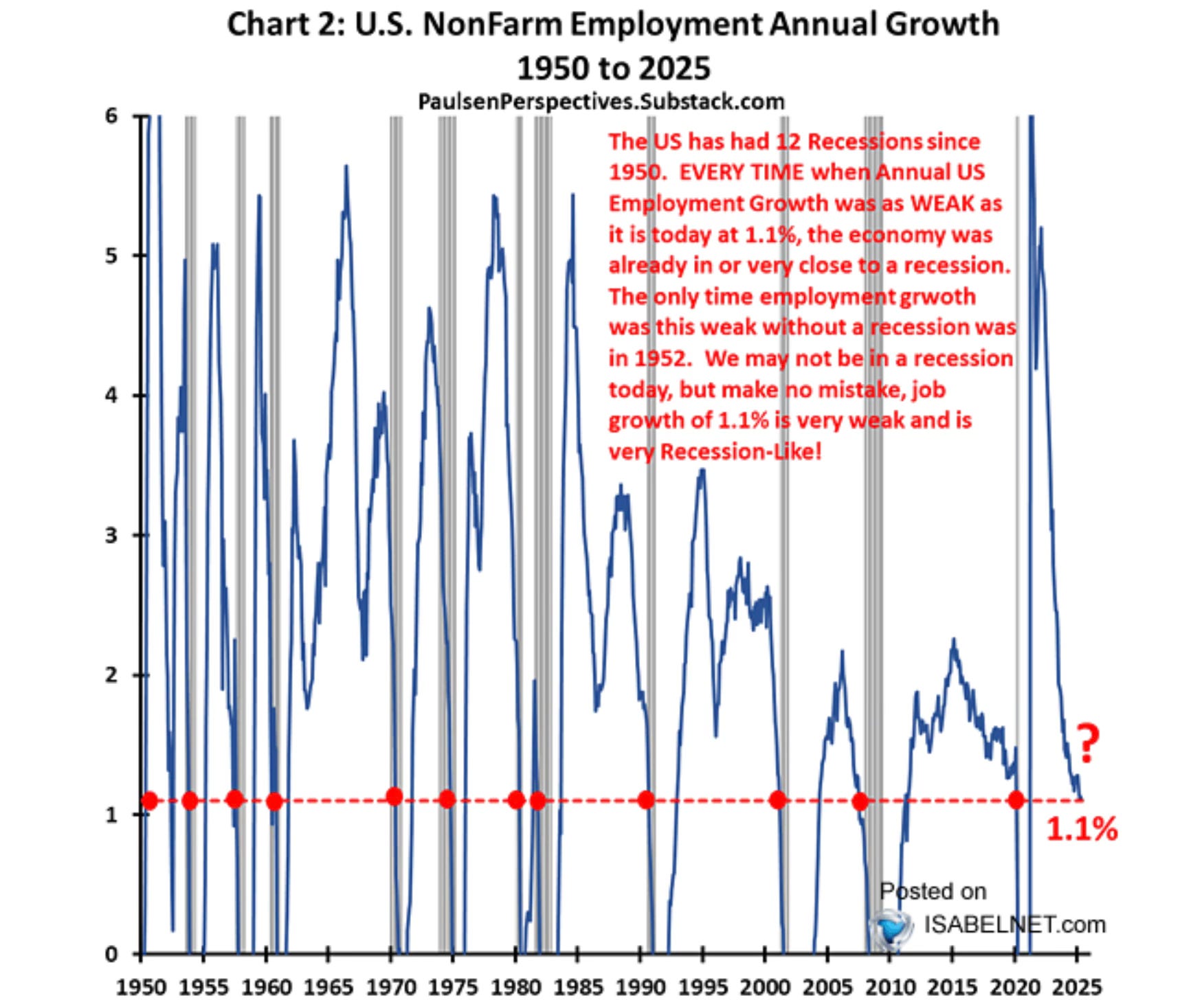 That 1.1% YOY job growth rate flashes a big red light. That level has coincided with periods right before or even during a recession going back to 1950. He believes the Fed should ease monetary policy soon.