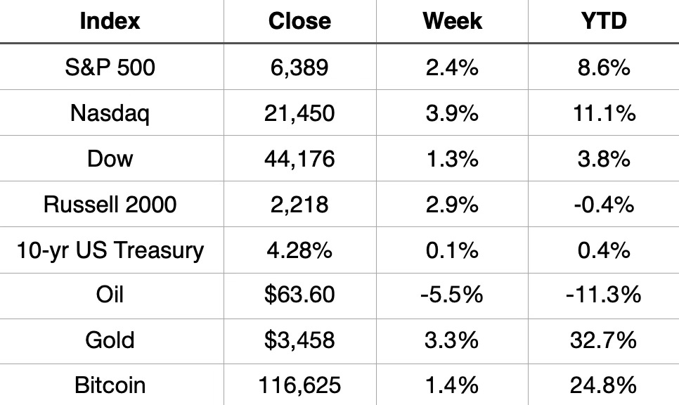 All the major indices finished up for the week. The S&P 500 closed right at the last all-time high level of 6,389. Finishing just shy of a new record. The Nasdaq posted a new record high to end the week.