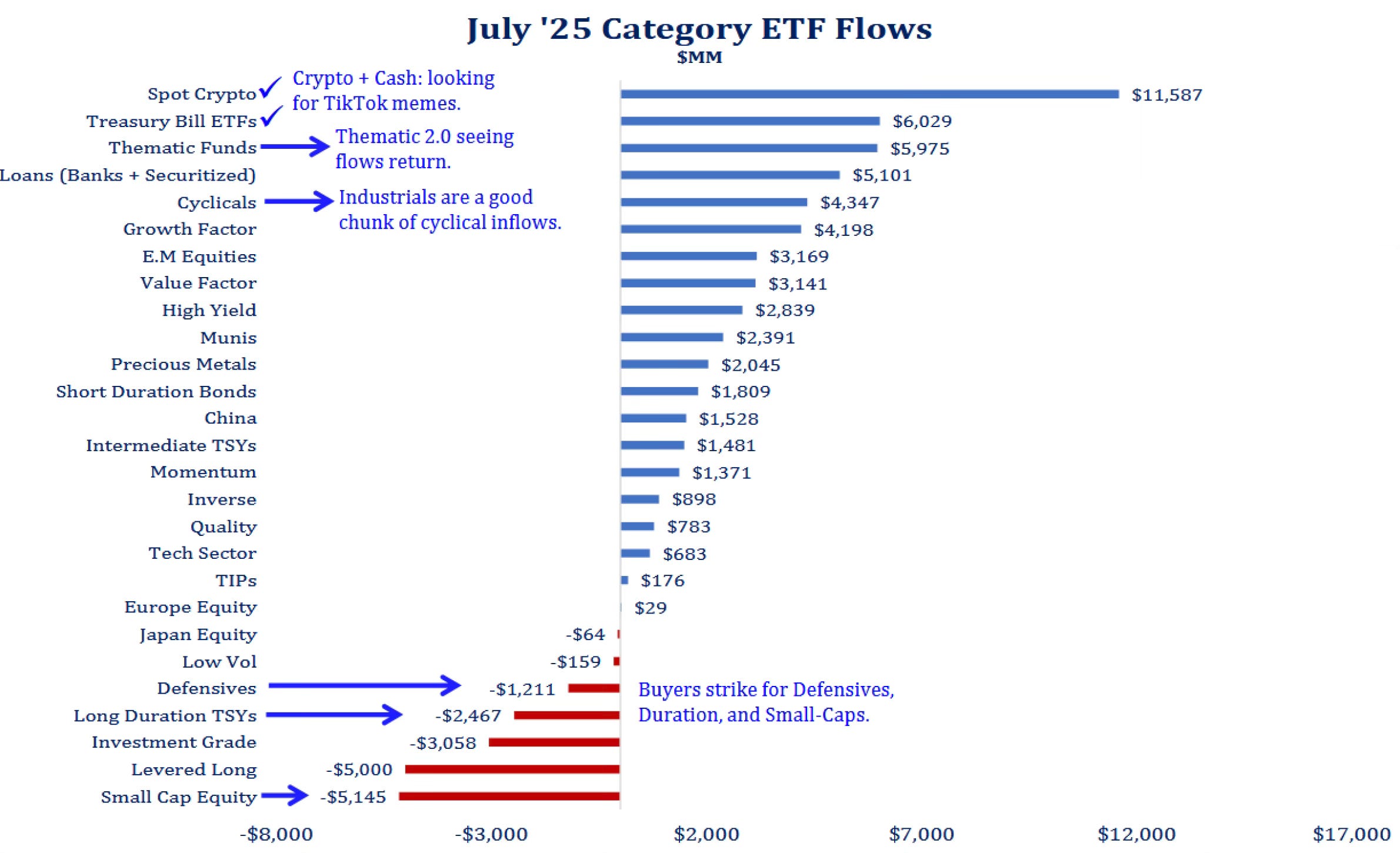 When we look at the ETF flows through July, we can see crypto has dominated flows. Thematic flows are returning as well. Small-caps just continue to get no love. The question is going to have to start being asked if small-caps are even investable.