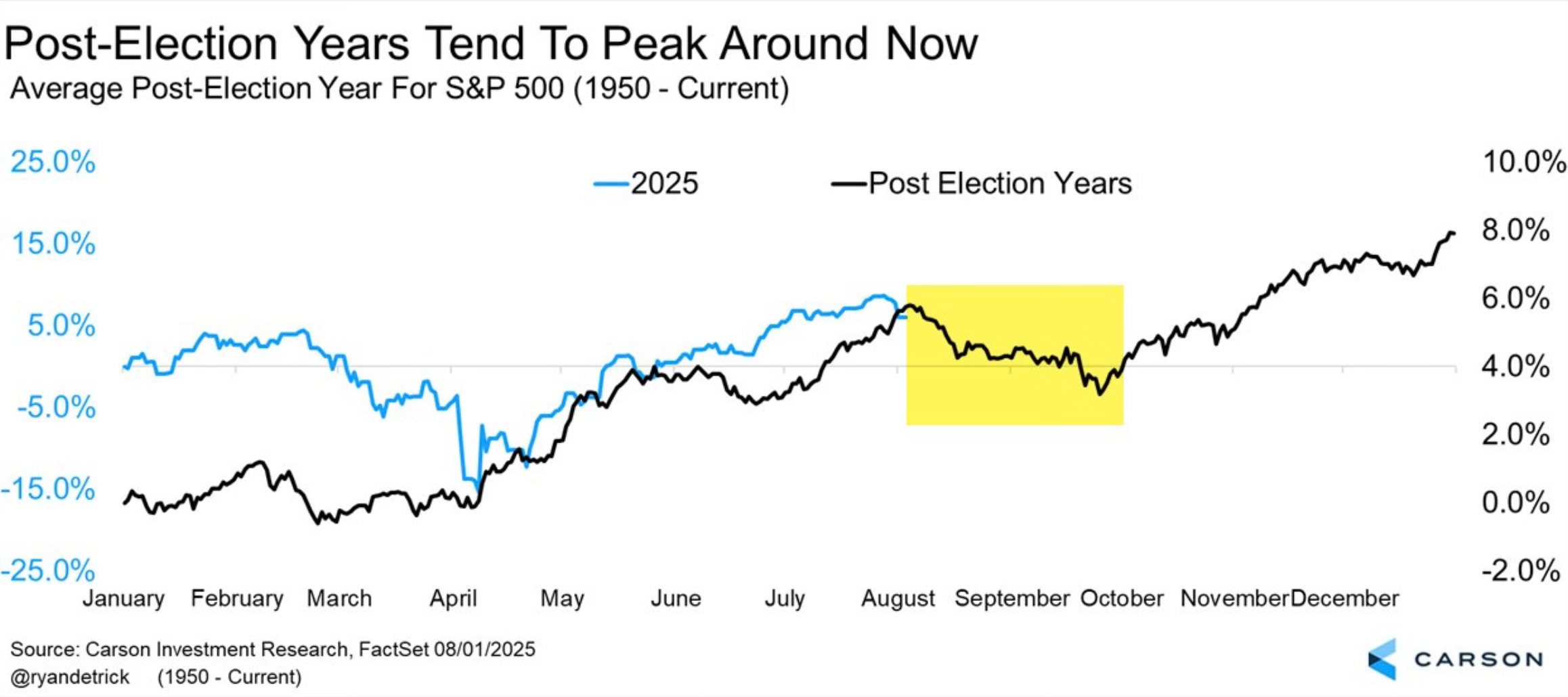 This chart from Ryan Detrick does a nice job showing historically what happens at this point in the post election cycle. Right about now in early August, the slide starts.