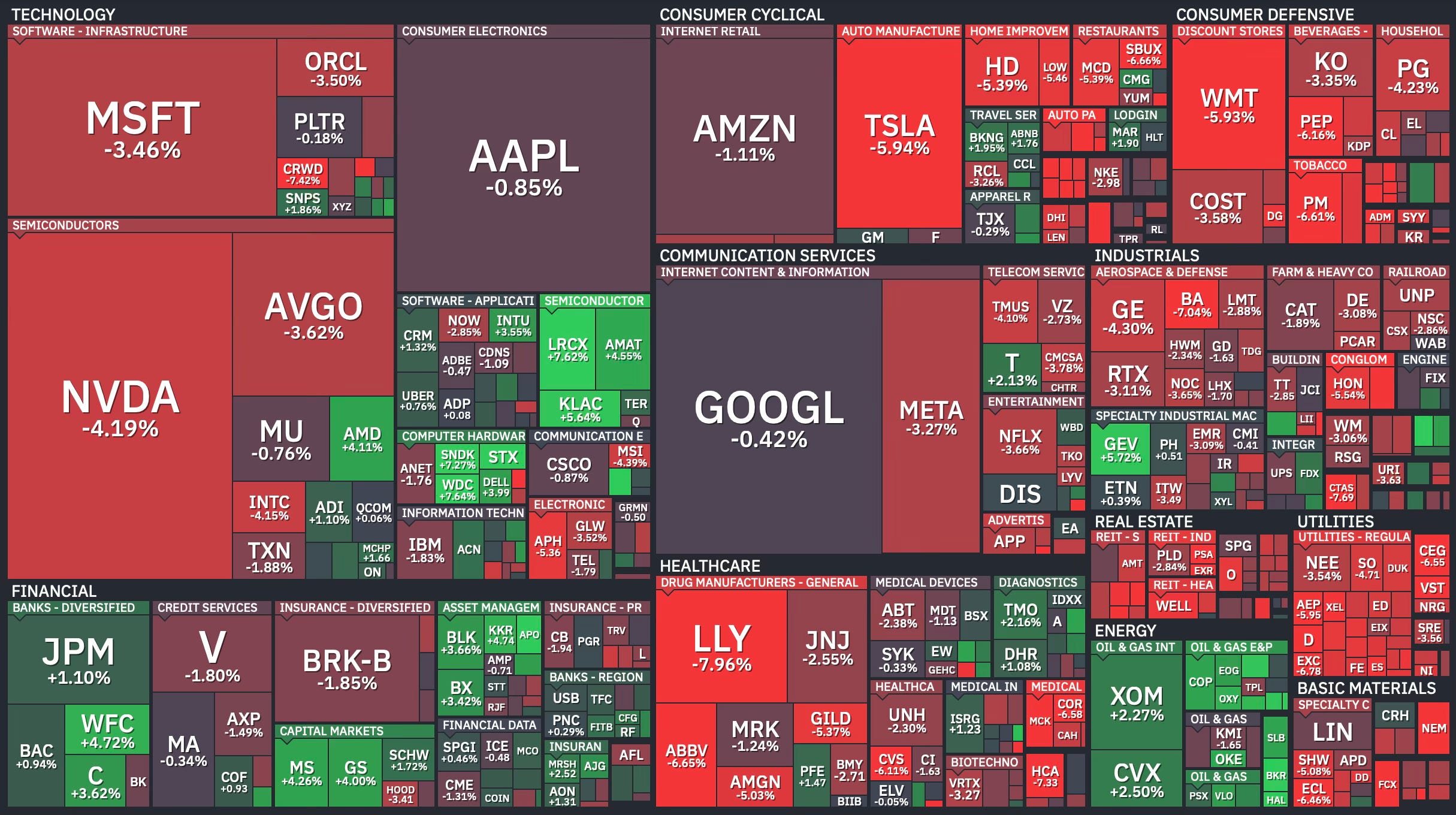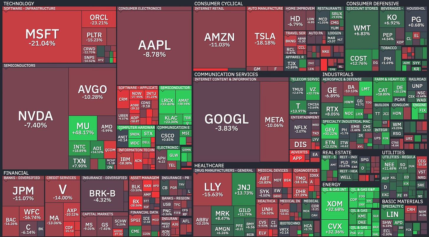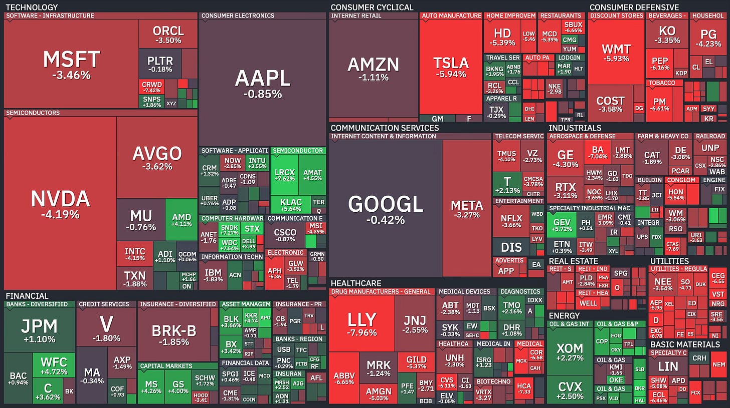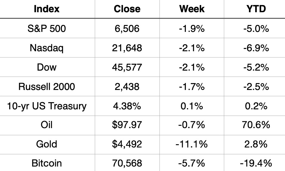 It was another rough week on Wall Street. The S&P 500 dropped 1.9% to close at 6,506, notching its fourth consecutive red week. That’s the longest losing streak in more than a year. The Nasdaq and Dow each fell 2.1%, and even the small-cap Russell 2000 couldn’t escape, sliding 1.7%.