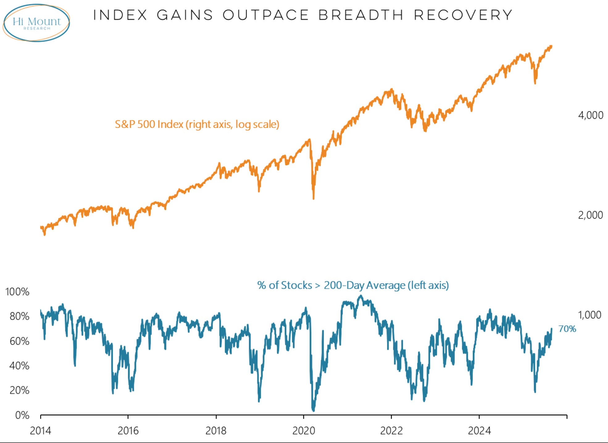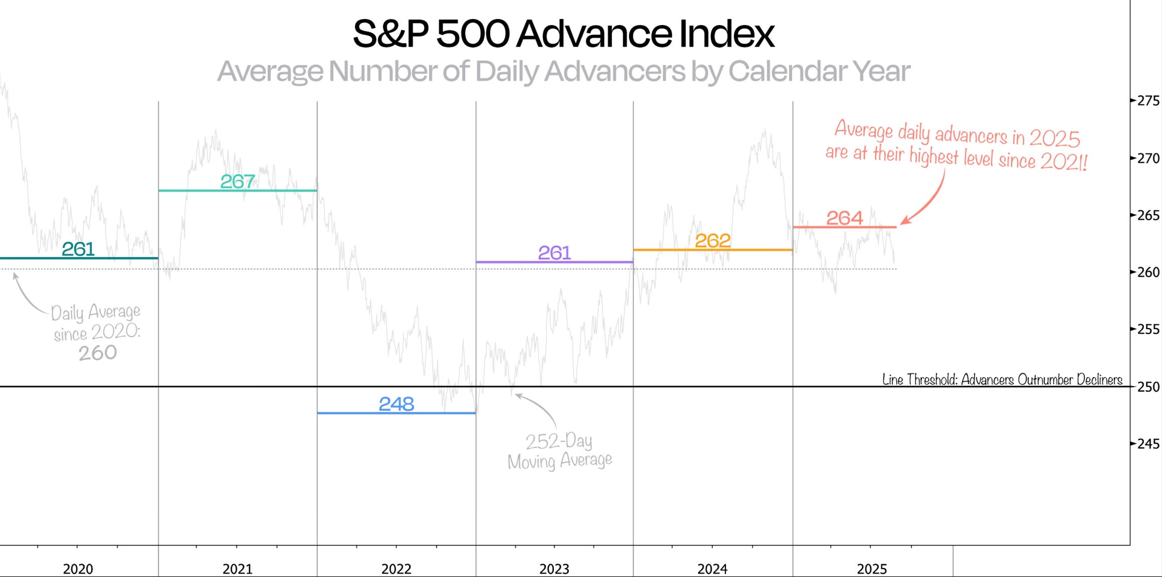 Here is a great chart that illustrates just that. This looks looks at the average number of S&P 500 stocks advancing each day. So far in 2025, that number is the highest since 2021.