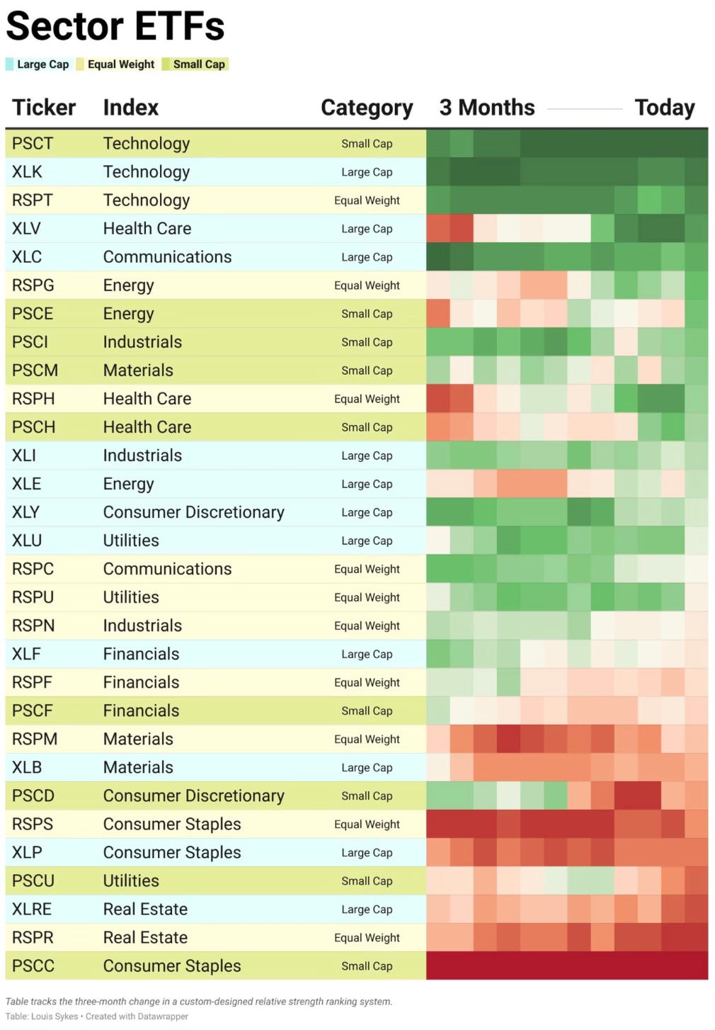 I love how this visual of the sector ETFs shows how the sector rotation has been playing out. Don’t fight the tape.