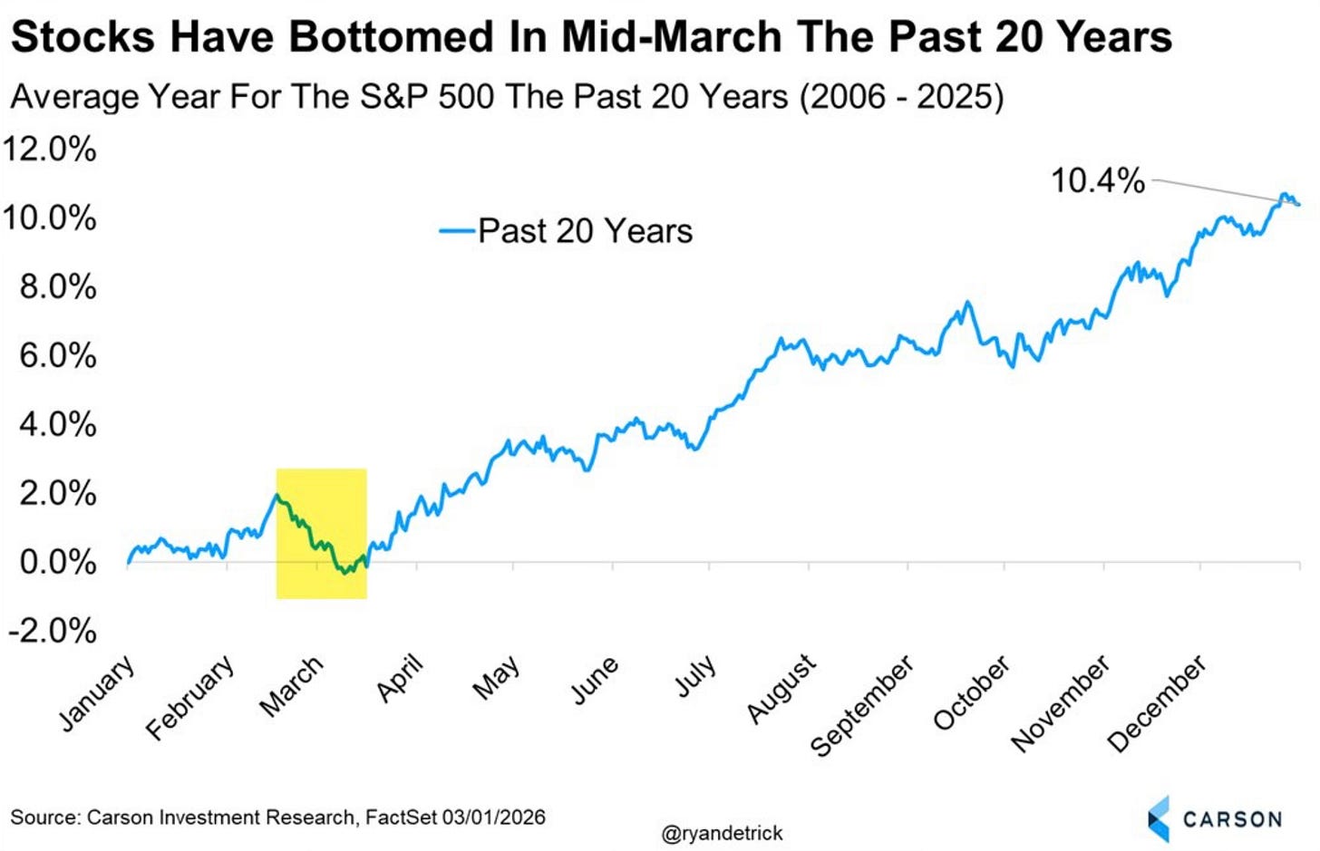 Ryan Detrick notes that mid-March has historically been the bottom of the average year going back to 2006. Yes, 2009 and 2020 are part of that story but the pattern is consistent enough to be worth noting.