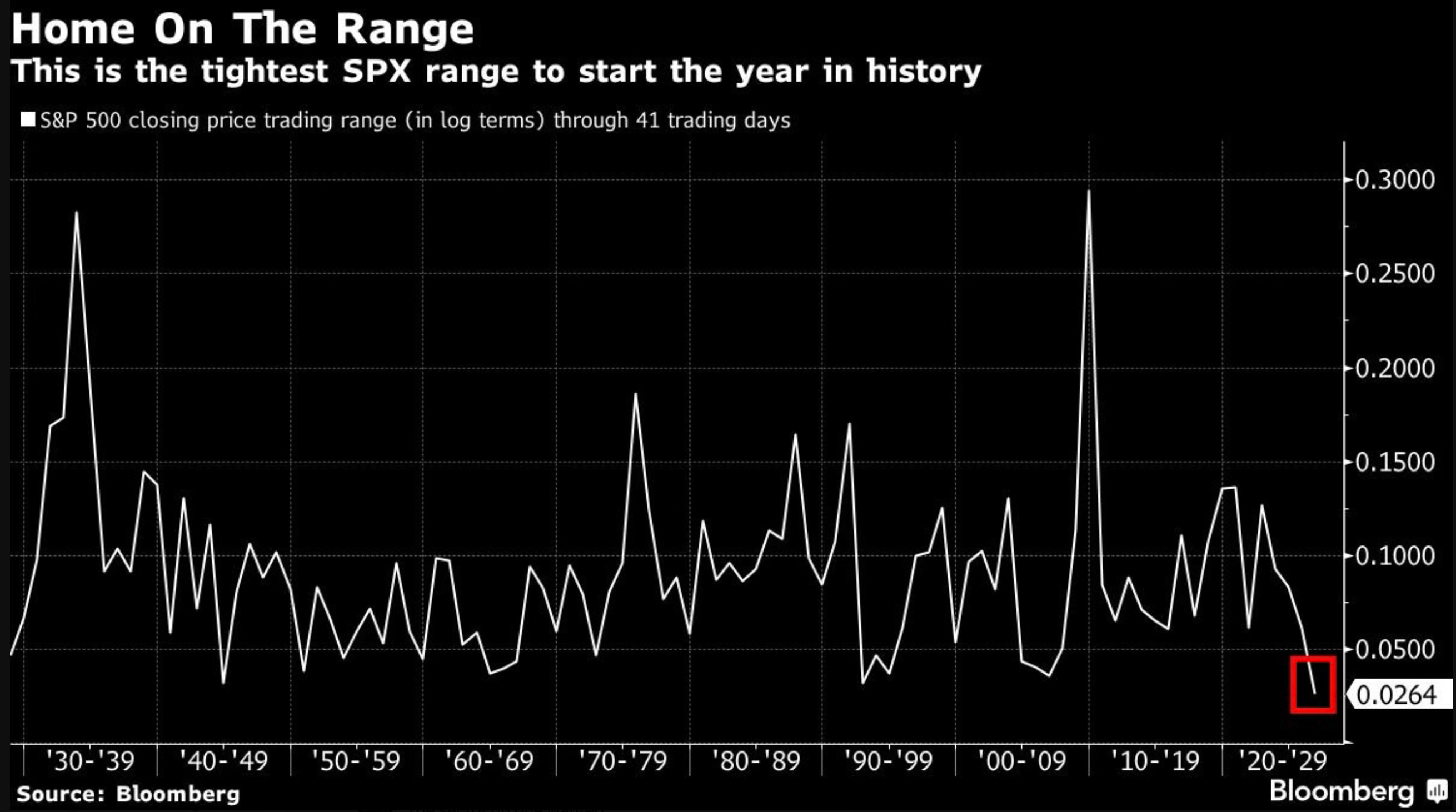 For all the noise this year with tariff threats, geopolitical tension, a jobs scare, and a volatility spike. The S&P 500 has actually been trading in a historically tight range. Through the first 41 trading days of 2026, the index has moved less than 4% from high to low. According to Bloomberg data, that is the narrowest starting range in market history, dating all the way back to the 1930s.