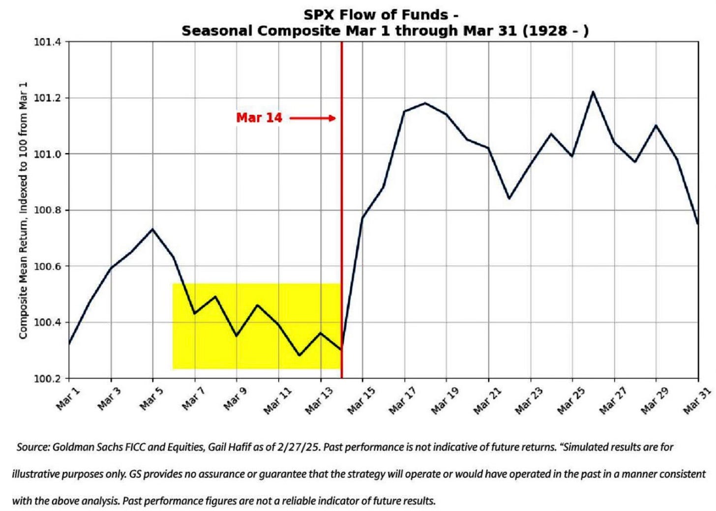 The Goldman Sachs Flow of Funds seasonal composite points to the same thing: the window from roughly March 6 through March 14 has historically been the soft spot, with strength typically returning after the 14th.