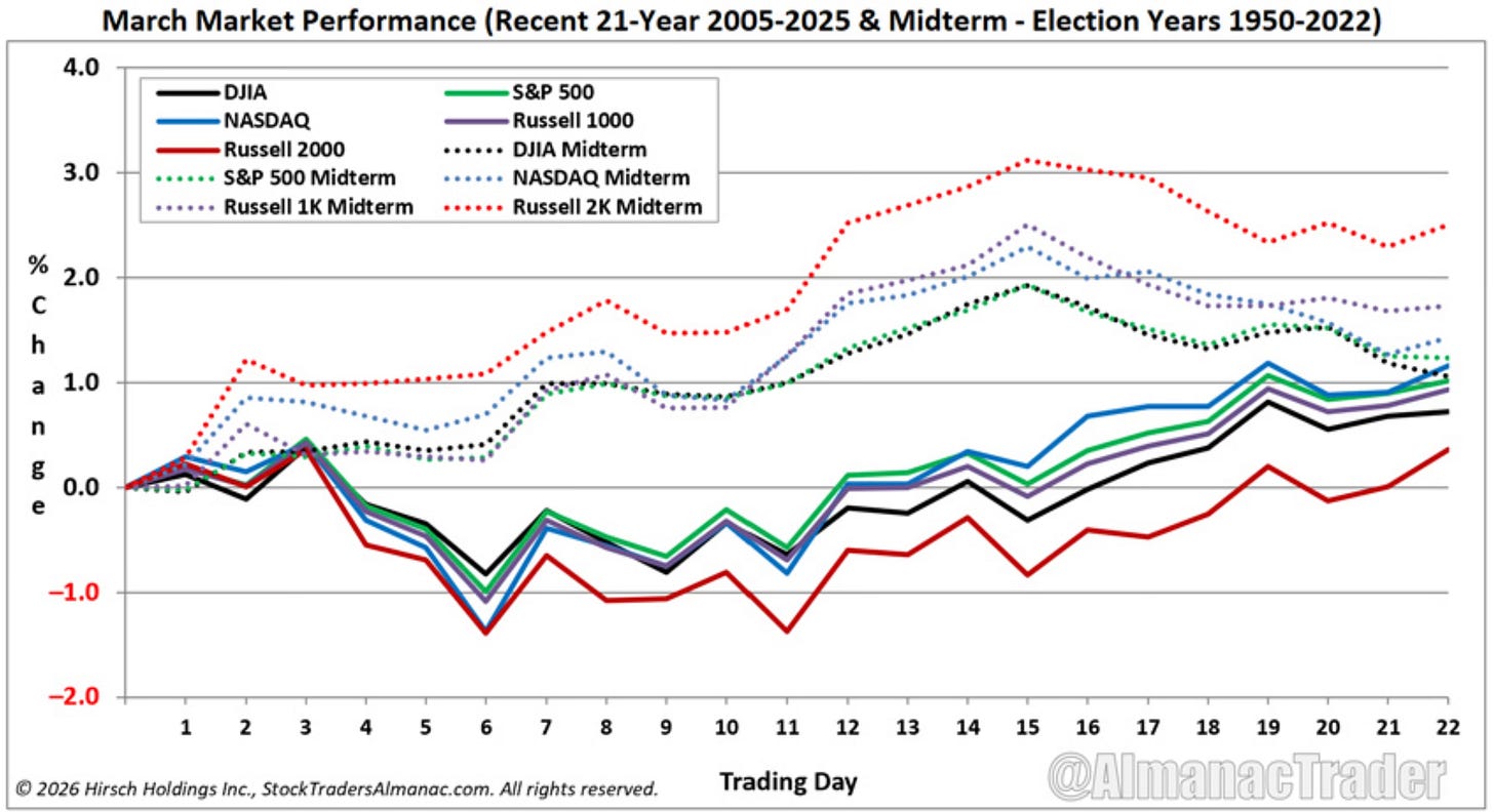 And for those watching the calendar closely. 2026 is a midterm election year. According to Jeff Hirsch at the Stock Trader's Almanac, March in midterm years has historically shown early strength that lasts longer, with the second half of March tending to outperform the first.