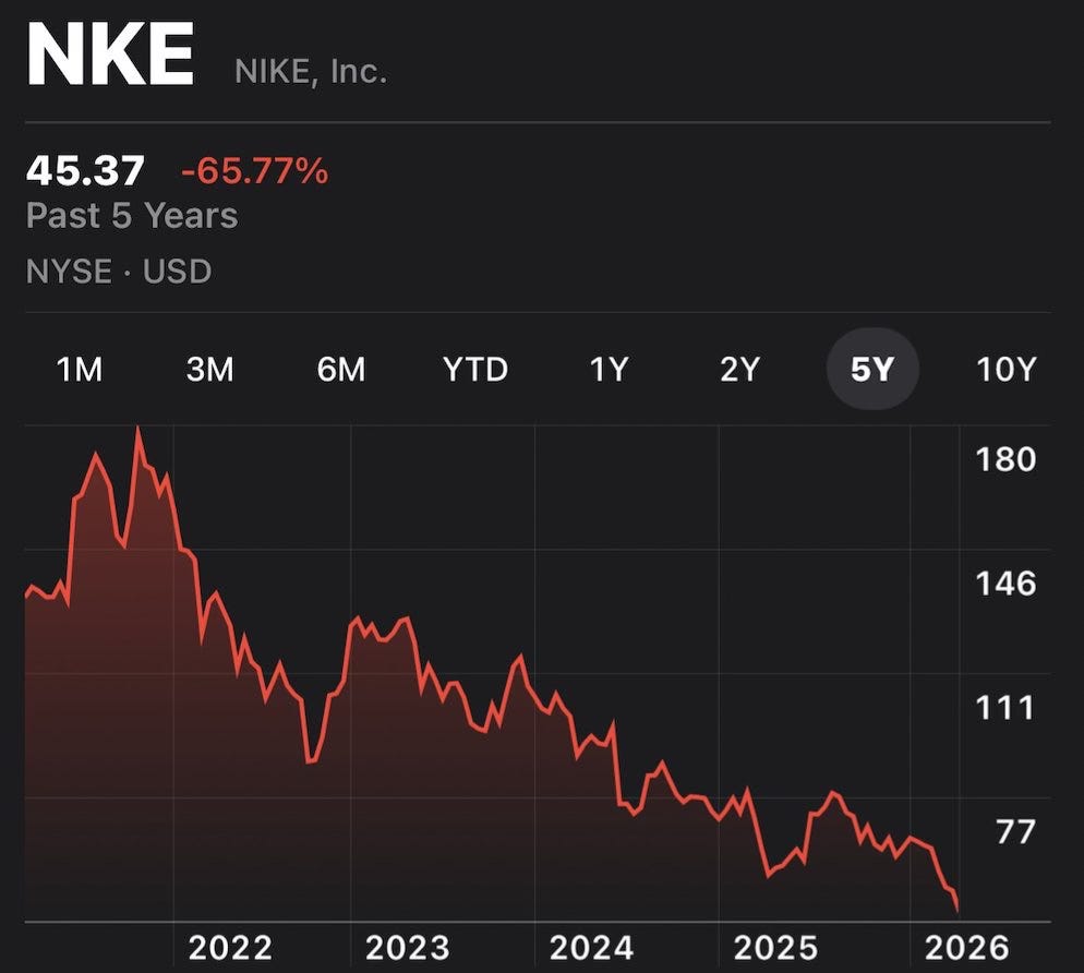 That’s not a typo. Nike is down 65.77% over the past five years.