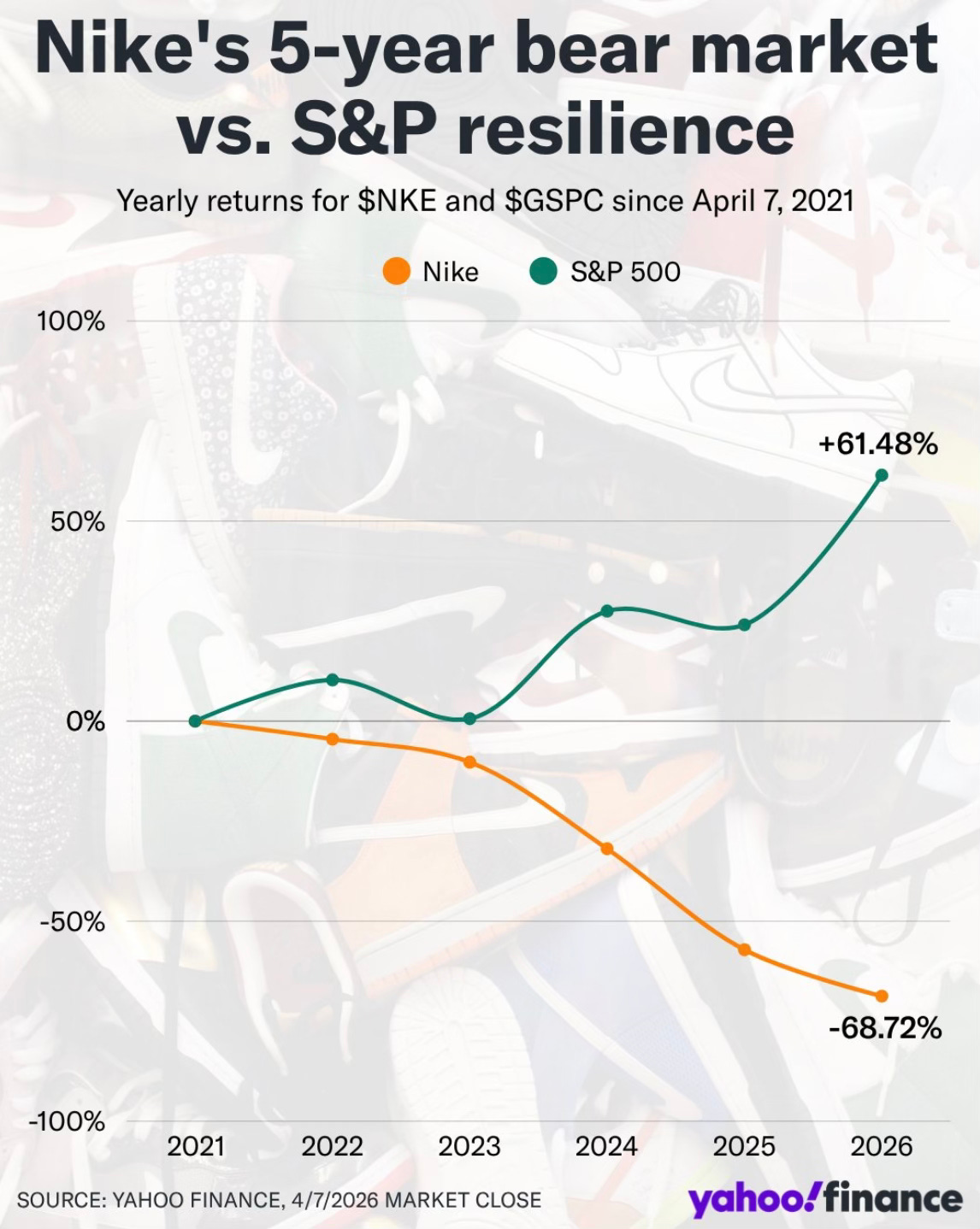 That chart is painful to look at. Two lines going in completely opposite directions. Nike has been one of the worst trades you could have made over the past several years.