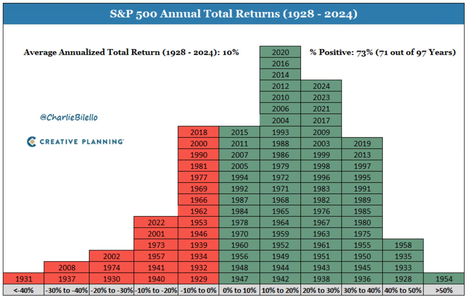 Over the past 97 years, the S&P 500 has been positive 73% of the time. The average annualized return during that time is 10%.