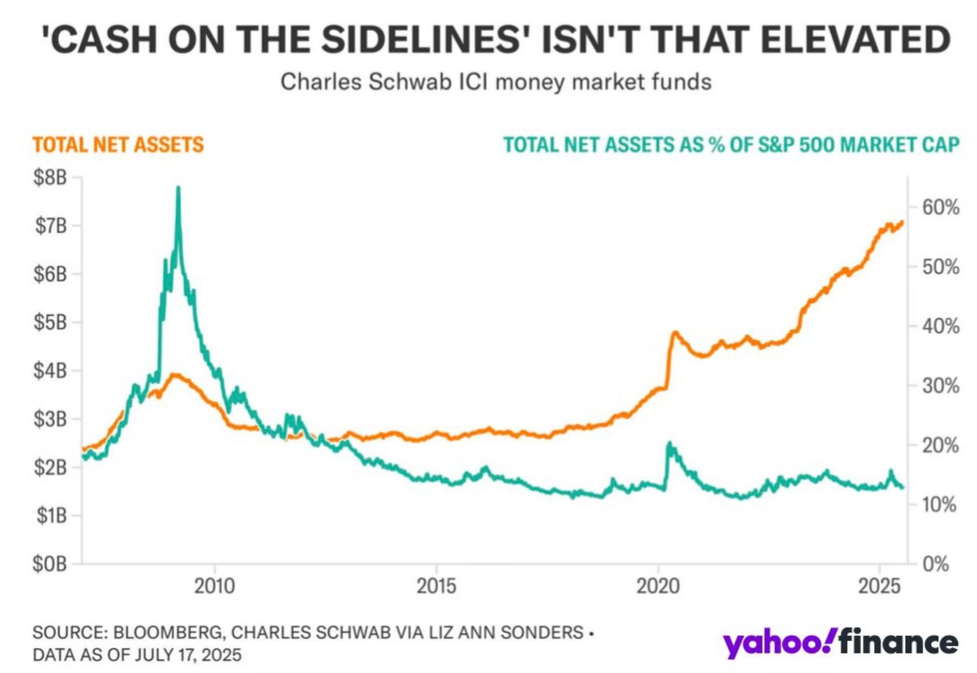 So when headlines scream about “record cash on the sidelines,” they’re really just describing a market that’s bigger than it used to be. The nominal dollar figure doesn’t tell you much about positioning or sentiment. It tells you the system as a whole has grown.