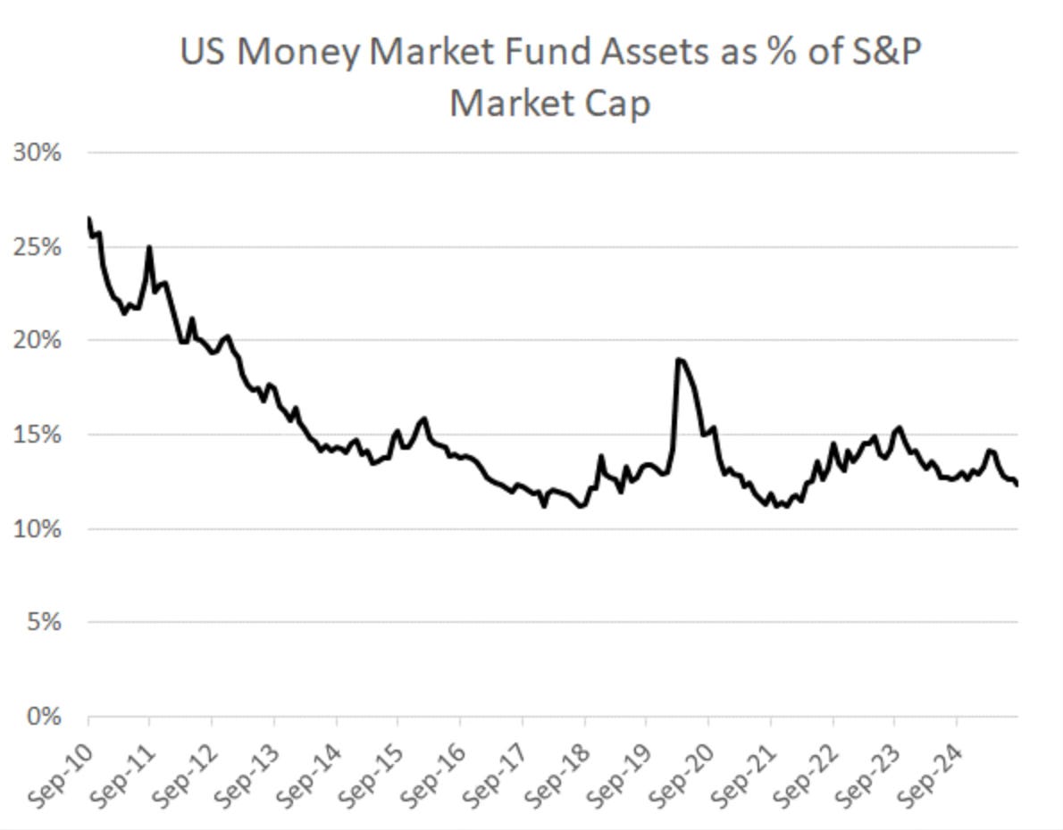 Yes, money market balances are at all-time highs. But so is the value of everything else. The S&P 500’s total market cap has surged over the last decade. Even as cash balances look large in absolute terms, they haven’t grown nearly as fast relative to total asset values.