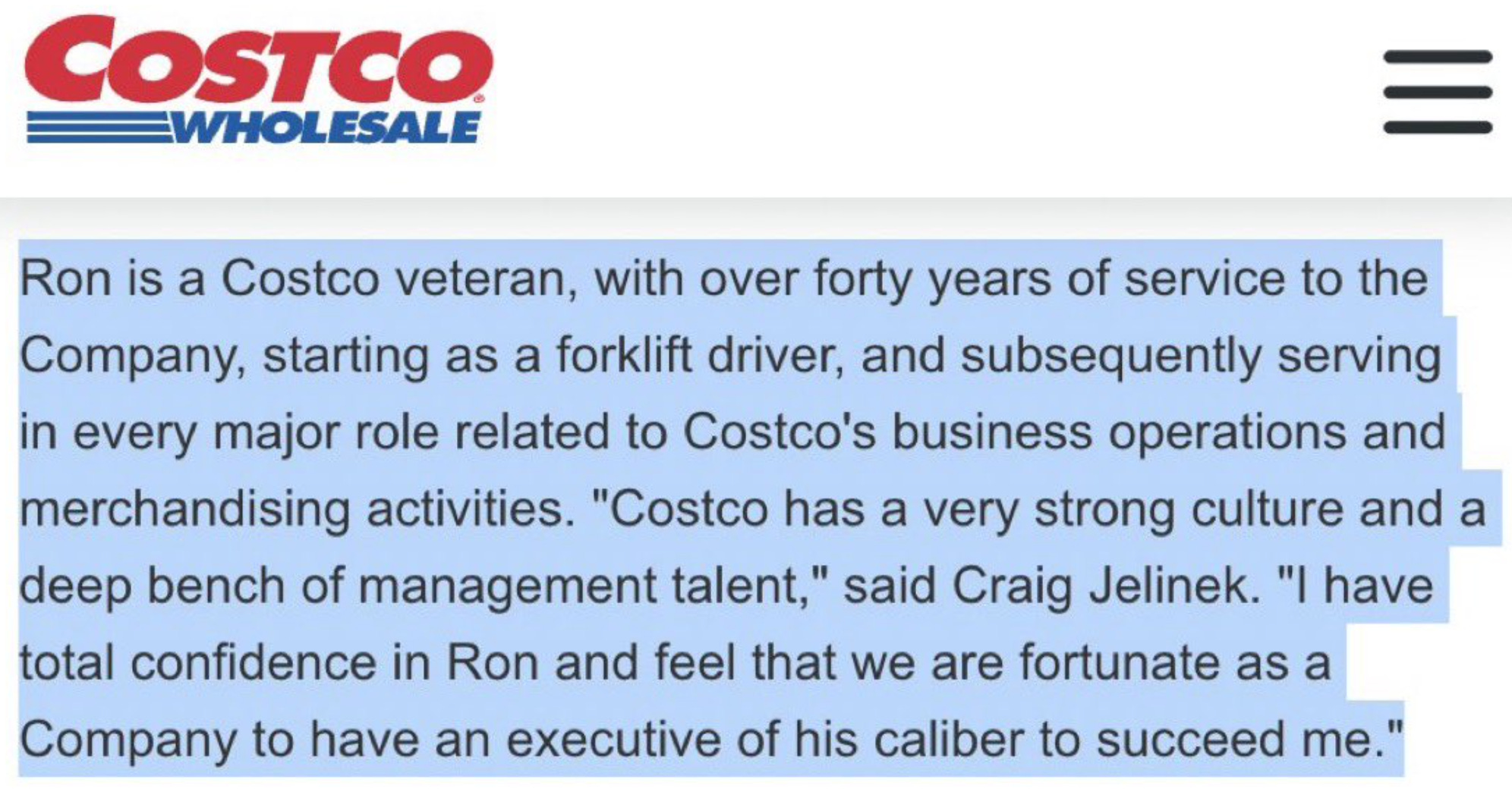Beginning as a forklift driver, Ron Vachris has worked his way up the Costco corporate ladder for over 40 years. What stuck out to me is that he has served in every major role related to Costco’s business operations and merchandising activities. Talk about working your way up the Costco corporate ladder.