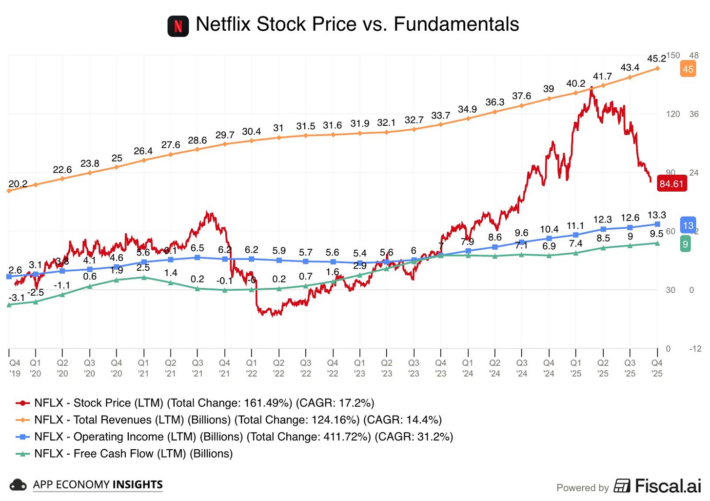 Fair questions. Netflix is sitting at $85 today, down from a 52-week high of $134. The company just beat earnings, crossed 325 million subscribers, and is growing revenue at 16%. On paper, this looks like the opportunity everyone’s been waiting for.